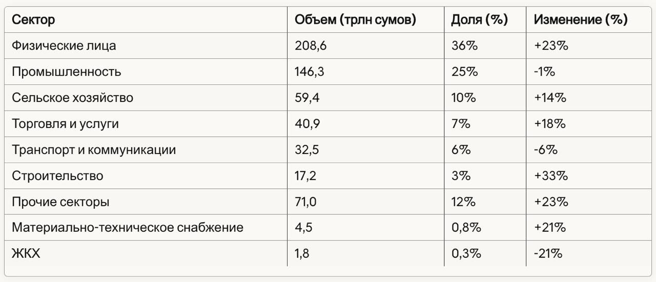 - Физлица занимают 36% портфеля — 208,6 трлн сумов (+23%);