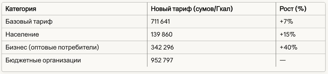 • Для населения рост на 15% до 139 860 сумов за 1 Гкал (без НДС);