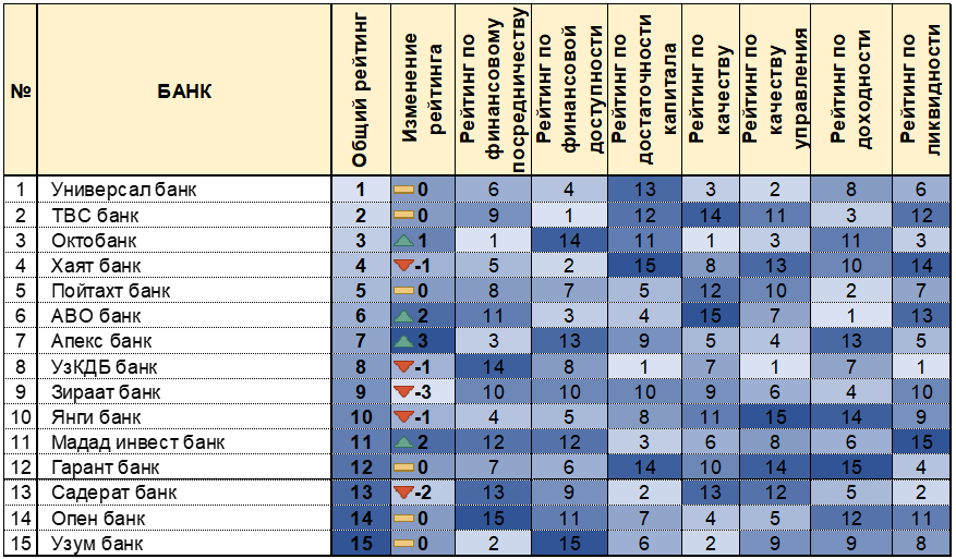 - Снижение: Hayot bank (−1), UzKDB bank (−1), Ziraat bank (−3), Yangi bank (−1), Saderat bank (−2).