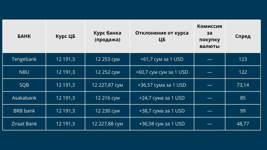 Наиболее высокие значения отклонения продемонстрировали Tengebank (+61,7 сума, спред 123 сума) и NBU (+60,7 сума, спред 122 сума). Также в группе повышенных значений оказался BRB Bank — +38,7 сума при спреде 99 сумов. Информация о комиссиях за покупку валюты для юридических лиц у указанных банков либо отсутствует в открытых источниках, либо напрямую не указана в тарифных документах.