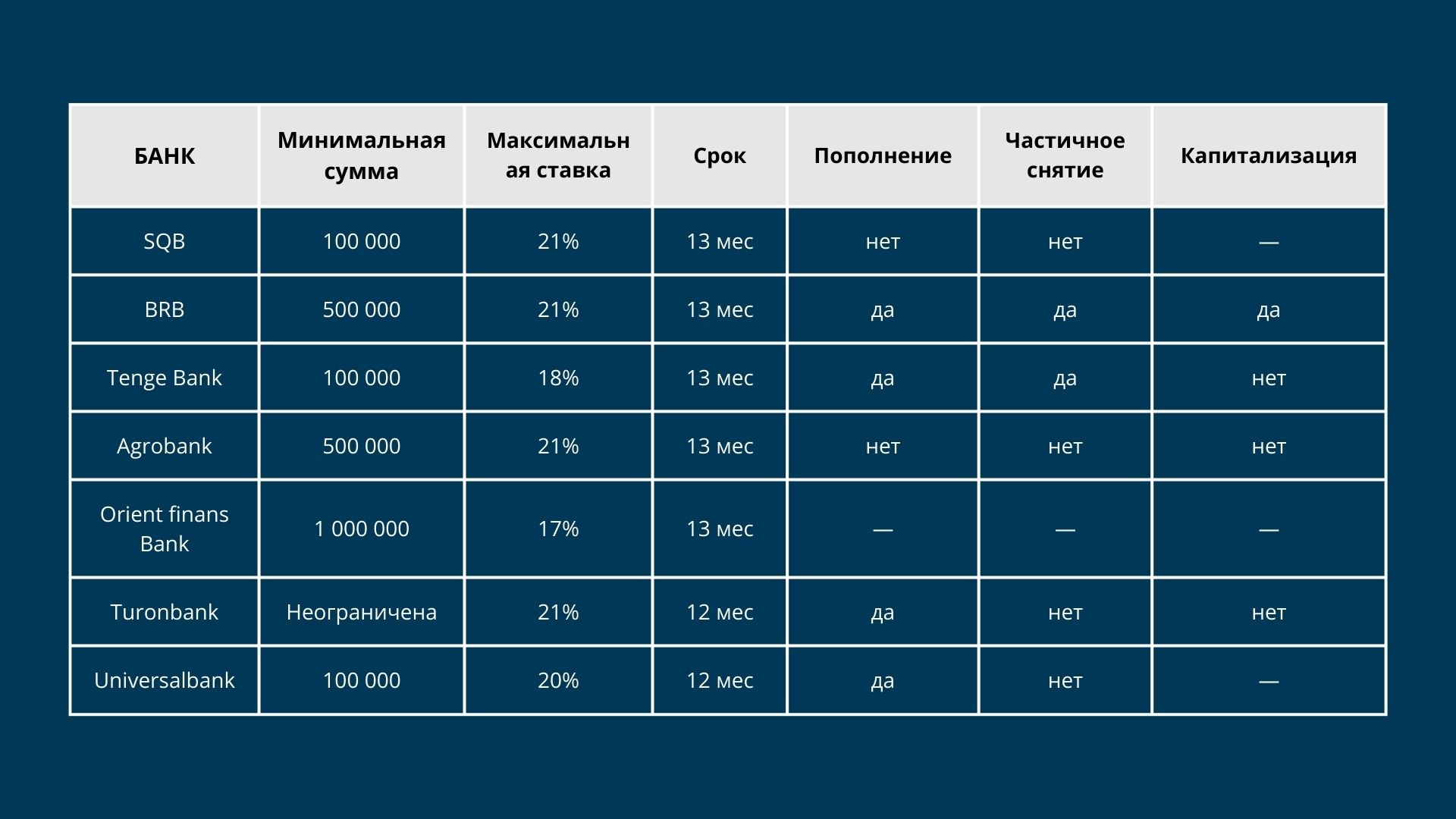 В этой группе максимальная ставка у большинства банков — 21% при сроке 13 месяцев (SQB, BRB, Agrobank), а у Turonbank — 21% при сроке 12 месяцев. Из рассмотренных предложений ниже по ставке идут Universalbank (20% на 12 месяцев), Tenge Bank (18% на 13 месяцев) и Orient finans bank (17% на 13 месяцев).