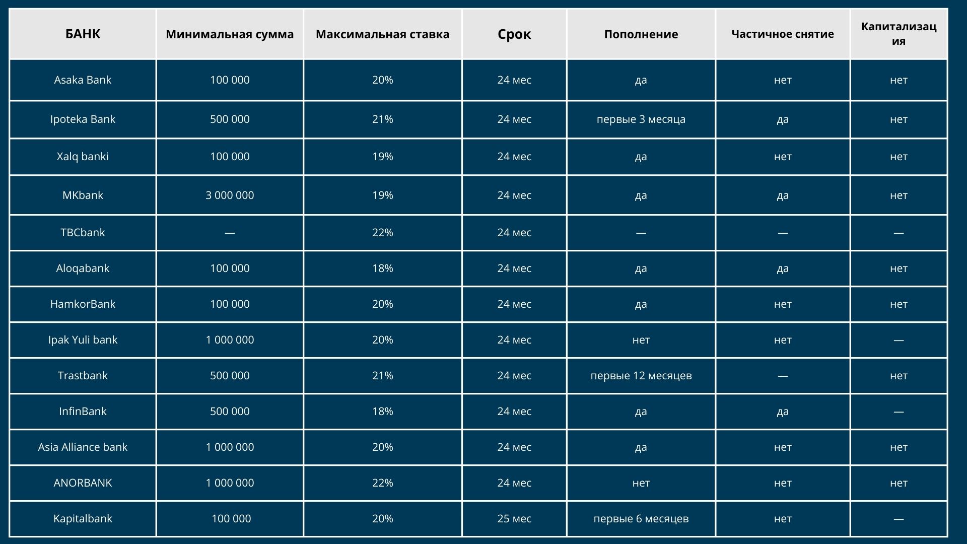 Пополнение на 24 месяцах чаще предусмотрено, но у ряда банков ограничено по времени: у Ipoteka Bank пополнять можно только первые 3 месяца, у Kapital bank — первые 6 месяцев, у Trast bank — первые 12 месяцев. При этом у Ipak Yuli bank и ANORBANK его нет, а у Asaka Bank, Xalq Bank, MKbank, Aloqabank, HamkorBank, InfinBank и Asia Alliance bank пополнение разрешается.