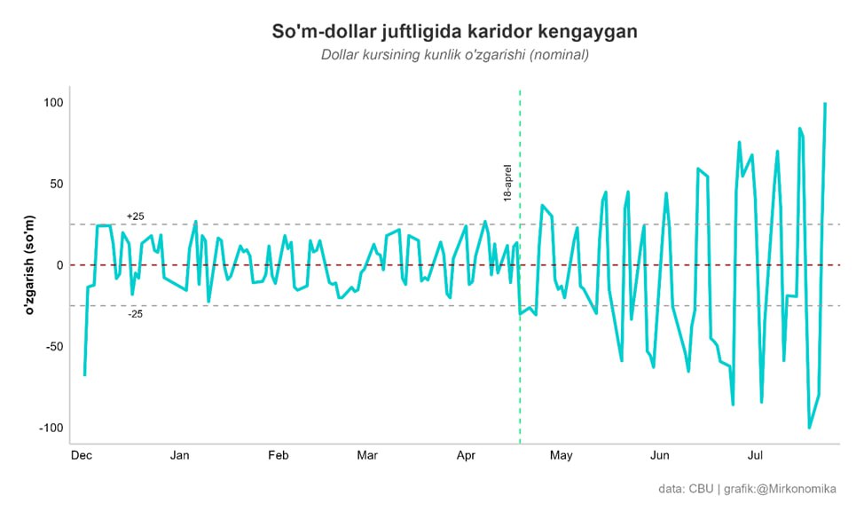 - Aprel oyining o‘rtalariga qadar dollarning so‘mga nisbatan kursi kuniga 25 so‘m atrofida o‘zgardi.
